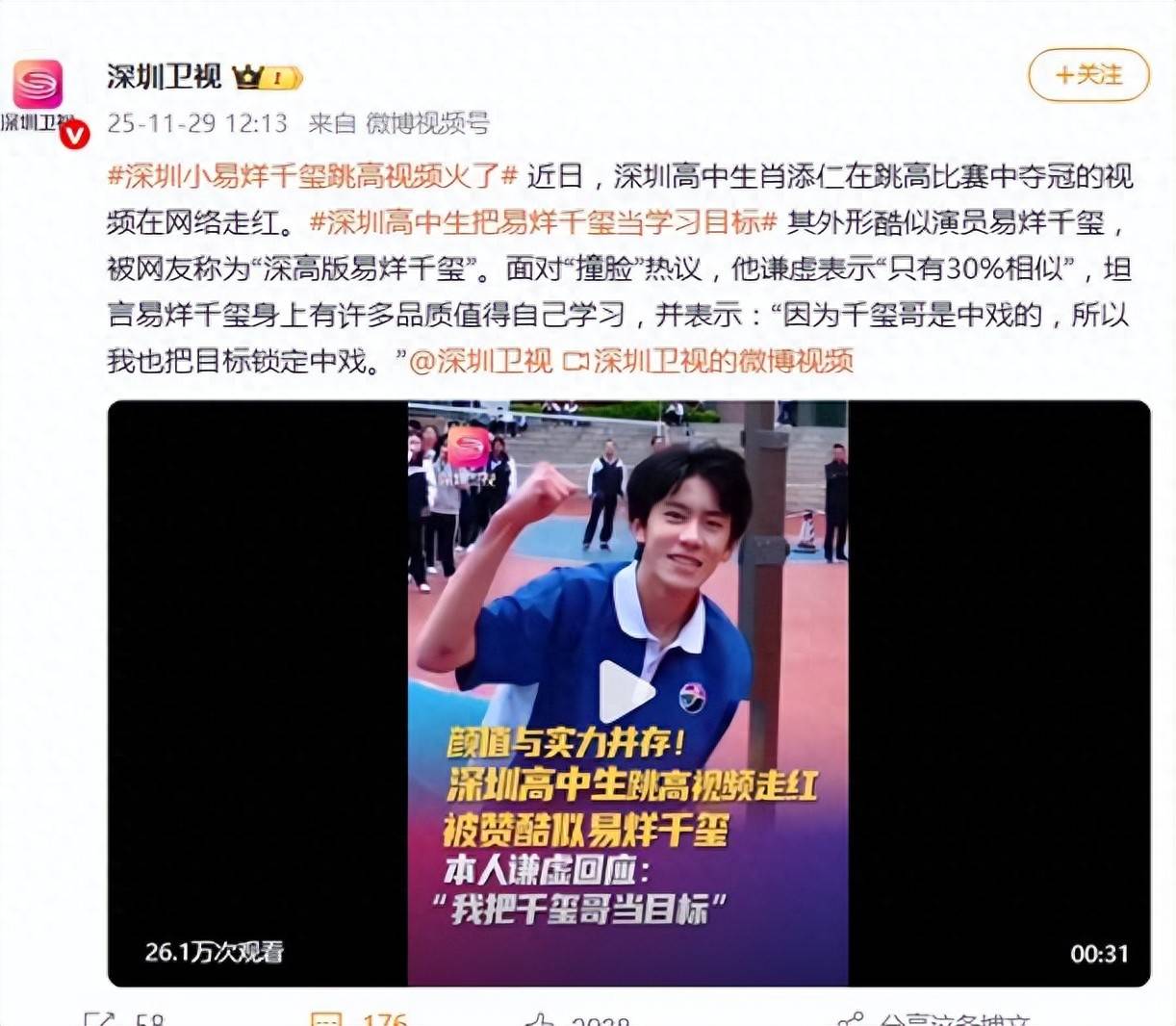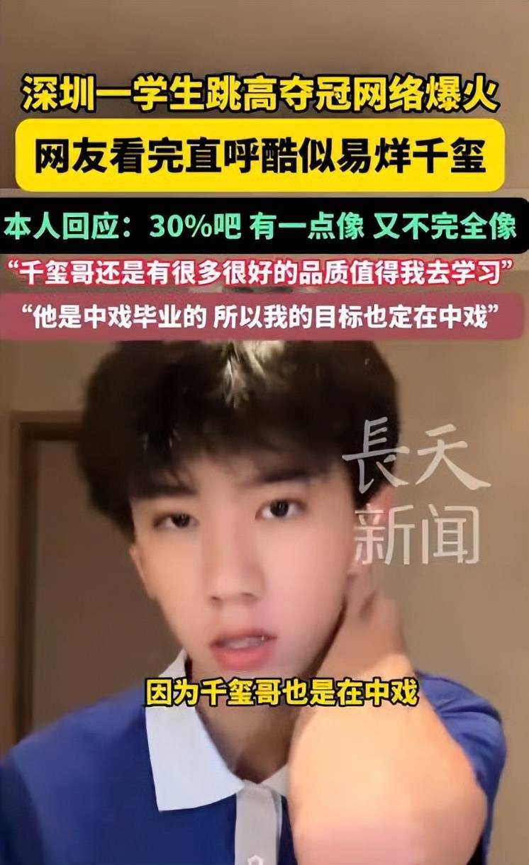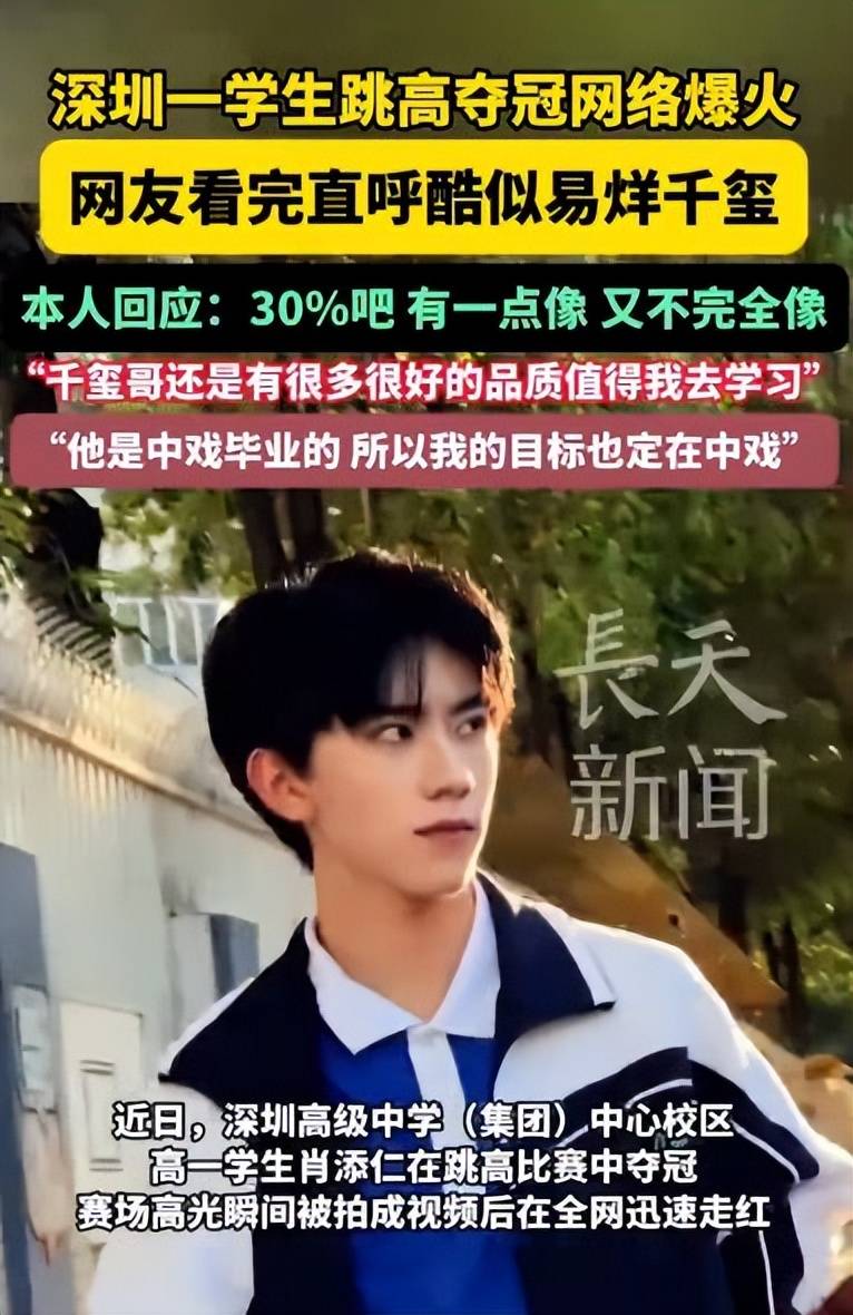 一条跳高视频让深圳高中生肖添仁站上了流量风口。视频中,少年助跑、起跳、背越式过杆的动作干净利落,最终斩获冠军。但真正引发全网热议的,是他那与顶流演员易烊千玺高度重合