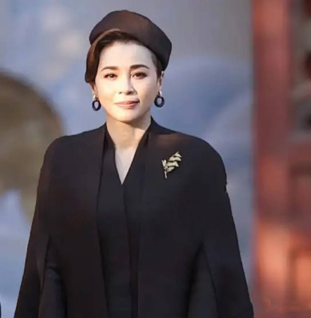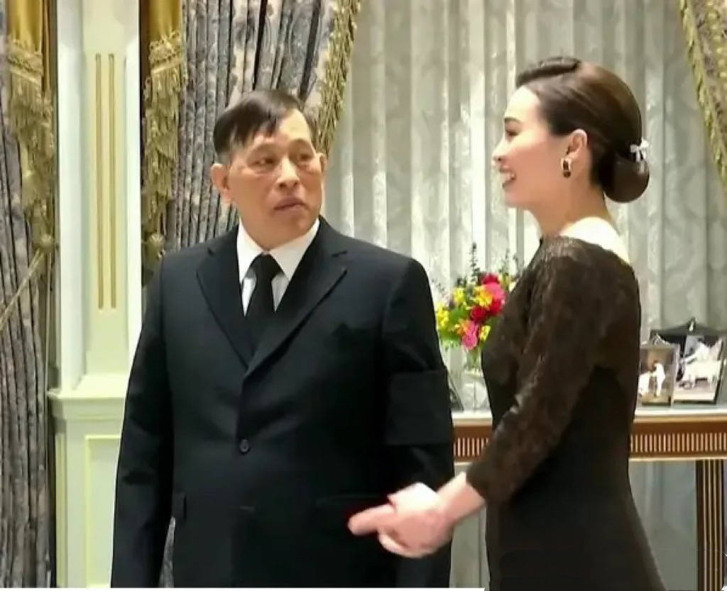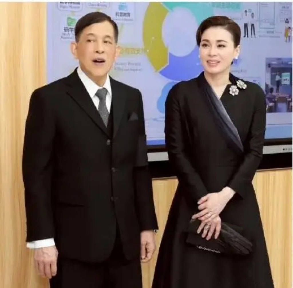 泰王玛哈穿了一身定制的黑色西装,苏提达也穿了黑色蕾丝连衣裙、配了同色系高跟鞋。头发挽起来,很大方。