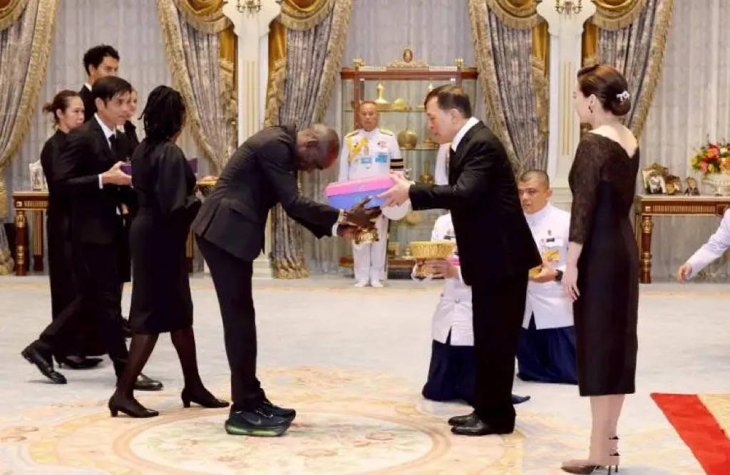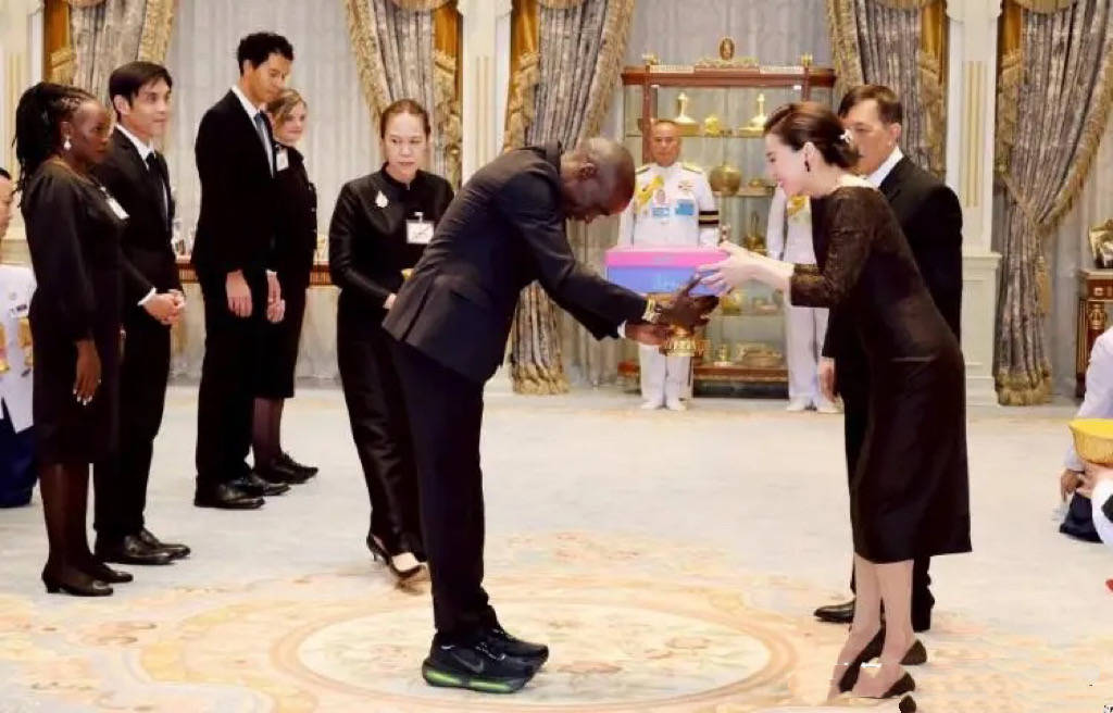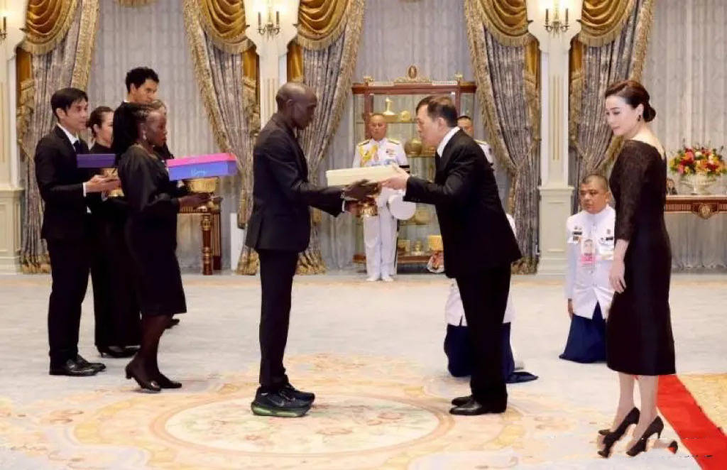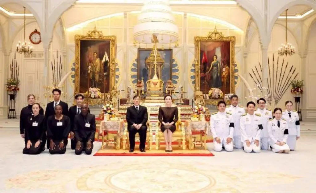 接着泰王和苏后又在王宫中会见了来自肯尼亚的客人,富丽堂皇的宫殿里、苏提达和泰王并排坐着,端庄大气。