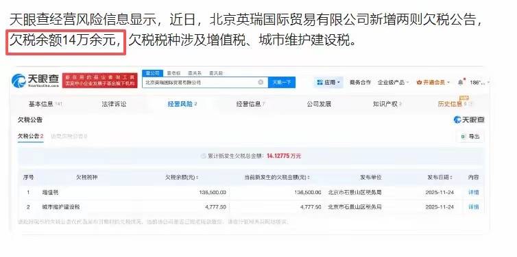 岳云鹏和妻子郑敏创办的“北京英瑞国际贸易有限公司”被曝欠税超14万元,这是一家涵盖了企业策划、设计等服务的公司。