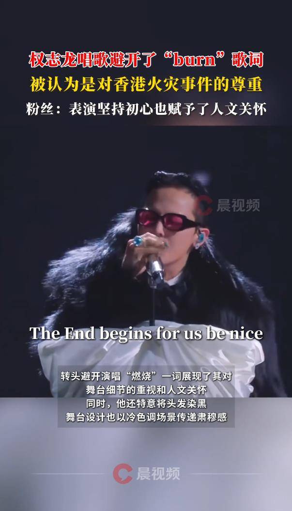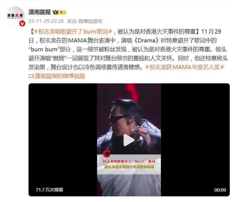 11月29日,MAMA颁奖礼的压轴舞台上,权志龙用一场“沉默的表演”引发了全网关注。在演唱歌曲《DRAMA》时,他刻意跳过了原歌词中的英文“burn burn”(燃烧)部分,并同步消音伴奏中的对应词汇,形成数秒静默留白。这一细节被现场观众和粉丝迅速捕捉,直指其与11月26日香港大埔火灾事件的关联——在灾情背景下,“燃烧”一词显得尤为敏感。