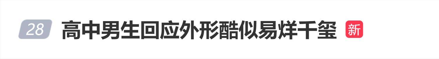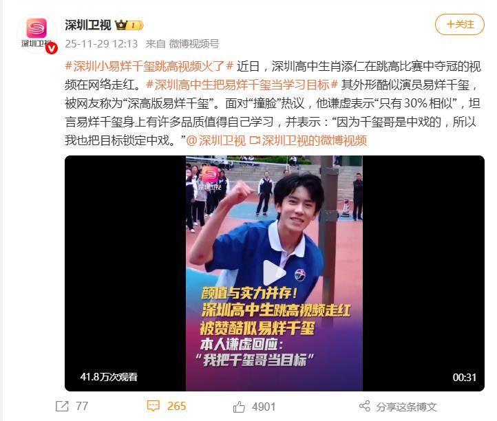 据11月30日报道,近日,一段深圳高中生在跳高比赛中夺冠的视频意外引爆网络。不过,让肖添仁真正出圈的并非那1.78米的背越式成绩,而是他眉眼间酷似顶流明星易烊千玺的外形。&ldqu