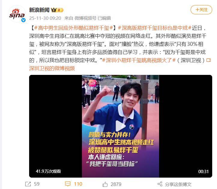 据11月30日报道,近日,一段深圳高中生在跳高比赛中夺冠的视频意外引爆网络。不过,让肖添仁真正出圈的并非那1.78米的背越式成绩,而是他眉眼间酷似顶流明星易烊千玺的外形。“深高版易烊千玺”的标签迅速发酵,连他自己都没想到,一场体育赛事竟演变成全网“撞脸”狂欢。