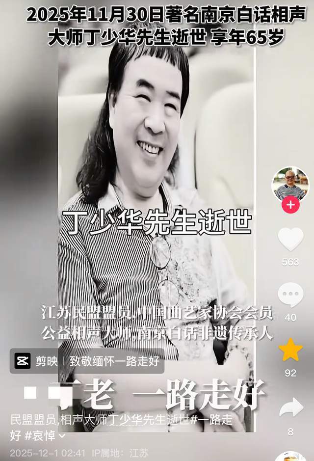 12月1号,2025年的最后一个月,没想到噩耗突然传来。据“中国民主同盟中央委员会”成员吴丹称,江苏民盟盟员南京白话非遗传承人,也是知名相声演员丁少华不幸去世,享年65岁。