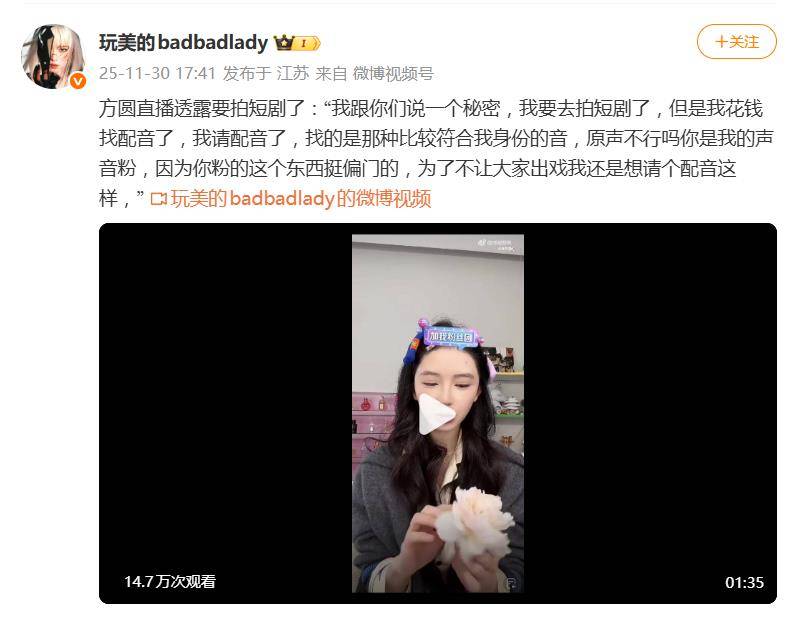 据网友11月30日爆料,在直播中,方圆正式宣布将进军短剧领域,拍摄个人首部作品。然而,与众多竭力展示“全能”的同行不同,她直接亮出了自己的“底牌”:自费聘请了专业配音演员。她给出的理由很直接——认为自己在短视频中极具生活化的原声,与短剧中的角色身份存在差距,担心粉丝“一听声音就想起直播唠嗑的样子”,从而破坏观剧的沉浸感。