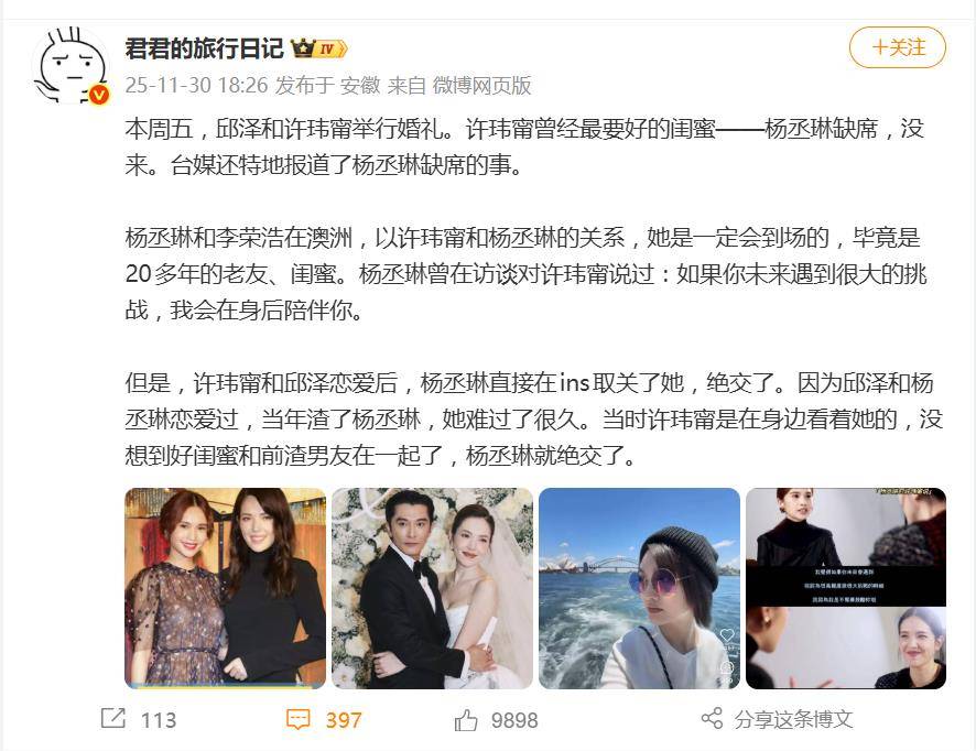 按理说,以杨丞琳和许玮甯“华冈五人帮”的铁杆交情,跨越地理距离出席婚礼本不是难事。杨丞琳曾公开对许玮甯承诺:“如果你未来遇到很大的挑战,我会在身后陪伴你。”然而,自2024年许玮甯与邱泽公开恋情后,杨丞琳直接在社交媒体上取关这位老友,两人彻底断联。