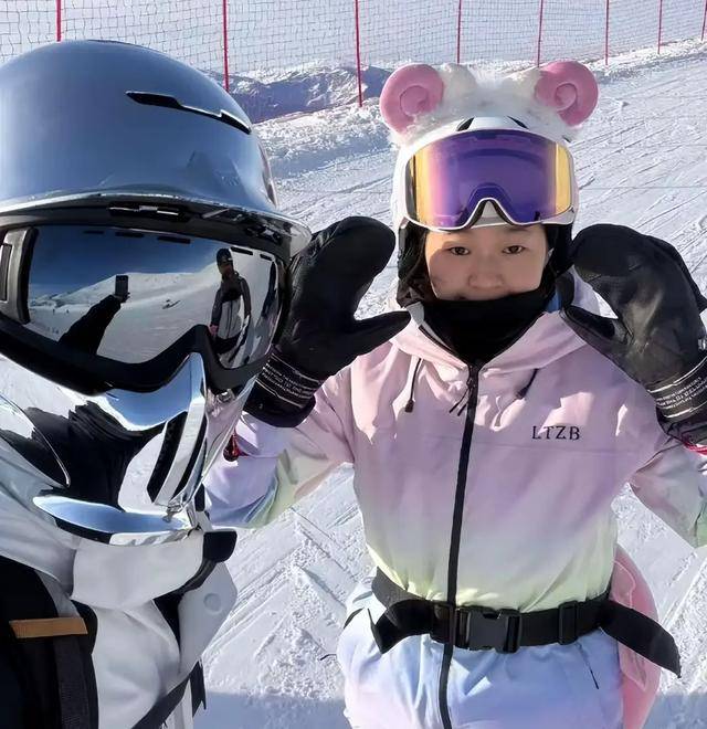 来到滑雪场,全红婵穿一身粉蓝色渐变滑雪服,屁股和膝盖戴着可爱的乌龟护具,跟着教练出发了。