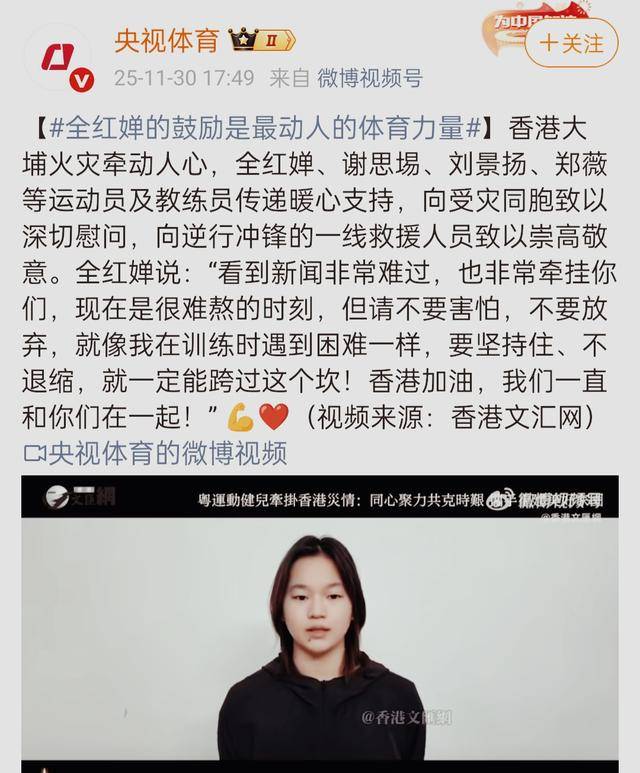 看到全红婵的视频,央视也转发了,他们一起为香港加油打气。