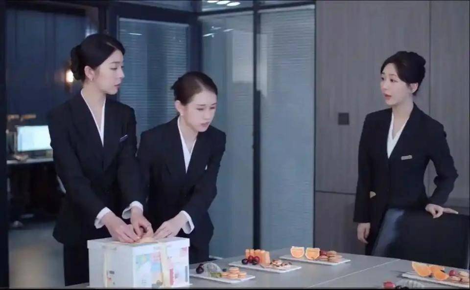 跟杨紫在《承欢记》同框时更有意思,俩人都穿黑西装扎丸子头,杨紫是顶配待遇的女主,她就演个叫 “莉莉” 的同事,台词没三句。