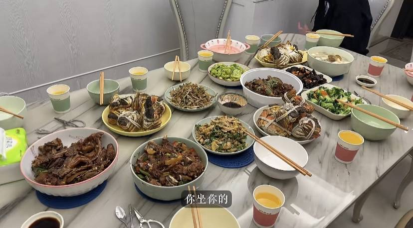 水亦诗真的是上得厅堂、下得厨房,一个人准备十几个大小伙子的饭菜,完全没有疲惫感。她炒的菜也很清淡,看着卖相不错。桌上的大闸蟹是公婆赞助的,只需要蒸熟就可以啦。