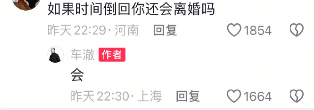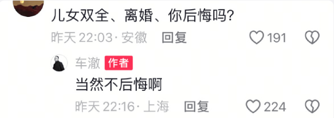 当网友在评论区询问:“儿女双全、离婚、你后悔吗?”车澈给出了直截了当的回答:“当然不后悔啊”。面对网友进一步追问:“如果时间倒回你还会离婚吗?”他依旧坚定地表示:“会”。如此干脆的回应,打破了大众对公众人物离婚后常有的隐晦态度,引发了众多猜测与讨论。