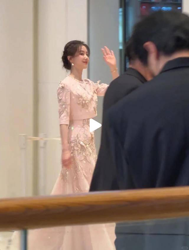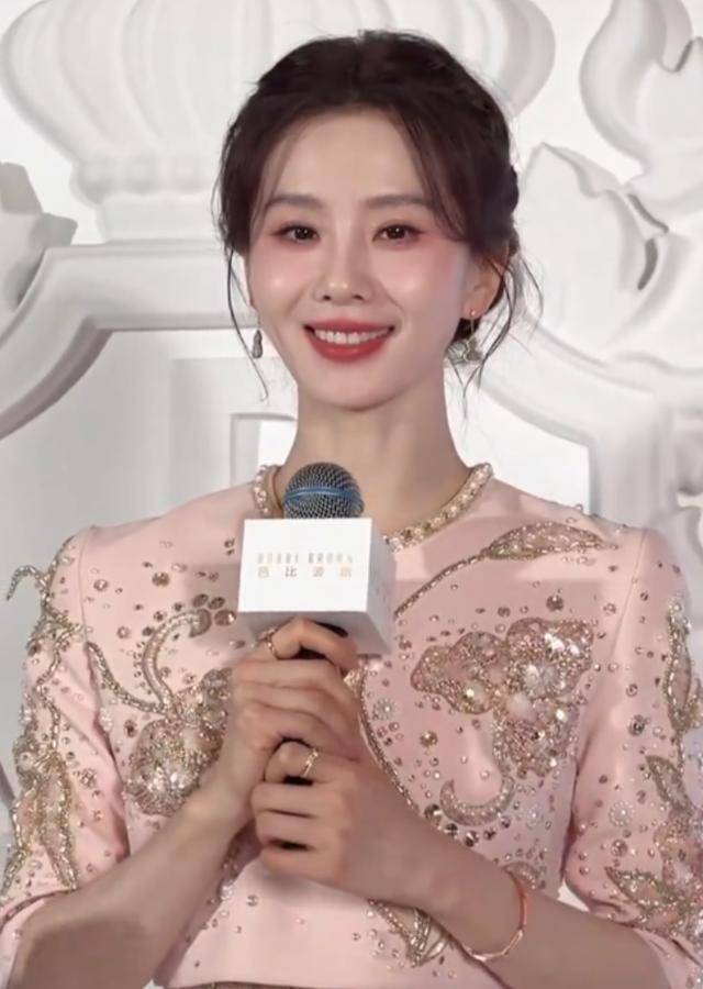 她身穿粉色长裙,衣服上绣着钻,把她天鹅颈拉得极长。