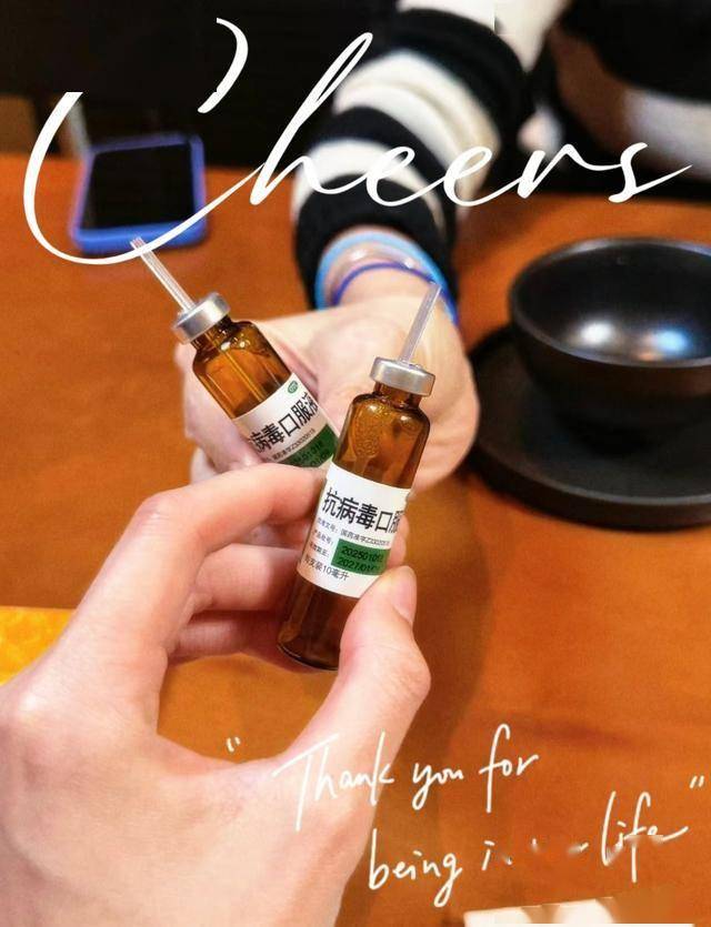 有一张是两人喝“抗病毒口服液”的照片,给人一种喝出了美酒的既视感,还不忘“碰杯”。