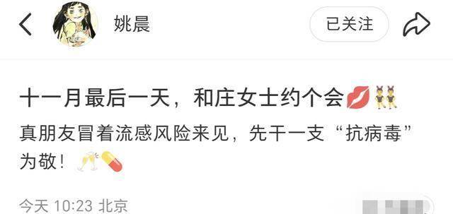 12月的第一天,姚晨更新了社交动态。她透露,昨天(11月30日)和庄达菲“约个会”。考虑到现在流感肆虐,为了保险起见两人先干一支“抗病毒”为敬!她还分享了一