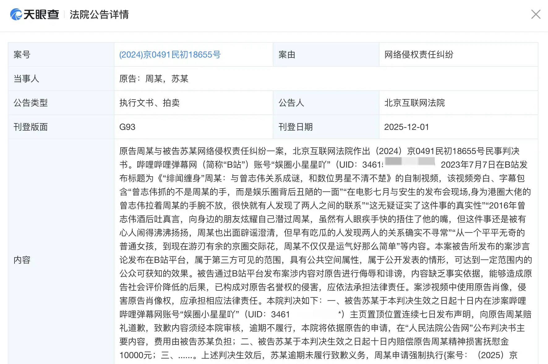 据天眼查显示,近日法院公告周冬雨起诉苏某某网络侵权纠纷一案民事判决书,判决书显示,被告苏某某曾公开发表曾志伟潜规则周冬雨、周冬雨是京圈交际花等言论,已构成对周冬雨名誉权的侵害,法院判决苏某某于判决生效之日起十日内向周冬雨公开赔礼道歉并赔偿精神损害抚慰金1万元。上述判决生效后,苏某某逾期未履行致歉义务,周冬雨申请强制执行。