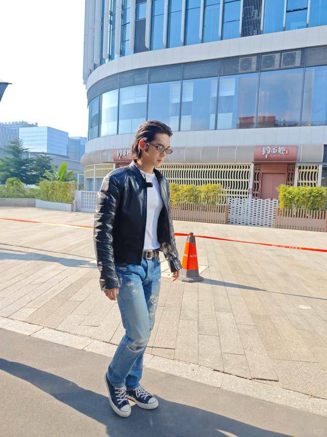 穿的那件棕色麂皮夹克,又是复古款,配上白T和宽松牛仔裤,整个人直接从“古装少年英雄”秒变“90年代街头大哥”。