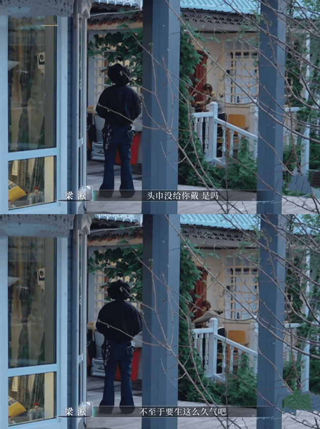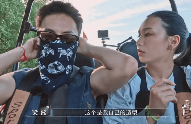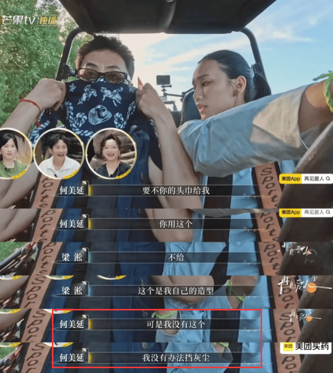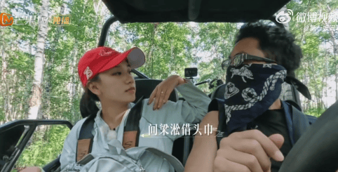 后来轮到何美延开车了,她没办法一边开车一边拿帽子遮挡沙尘,于是再跟梁淞开口,让梁淞把头巾给她遮一下。