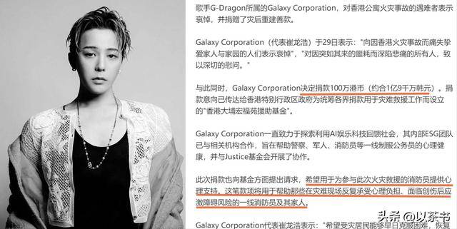 其中,前BIGBANG队长权志龙,他的捐款尤其让人印象深刻。他个人捐赠100万港币,特别要求善款用于消防员的心理支持。