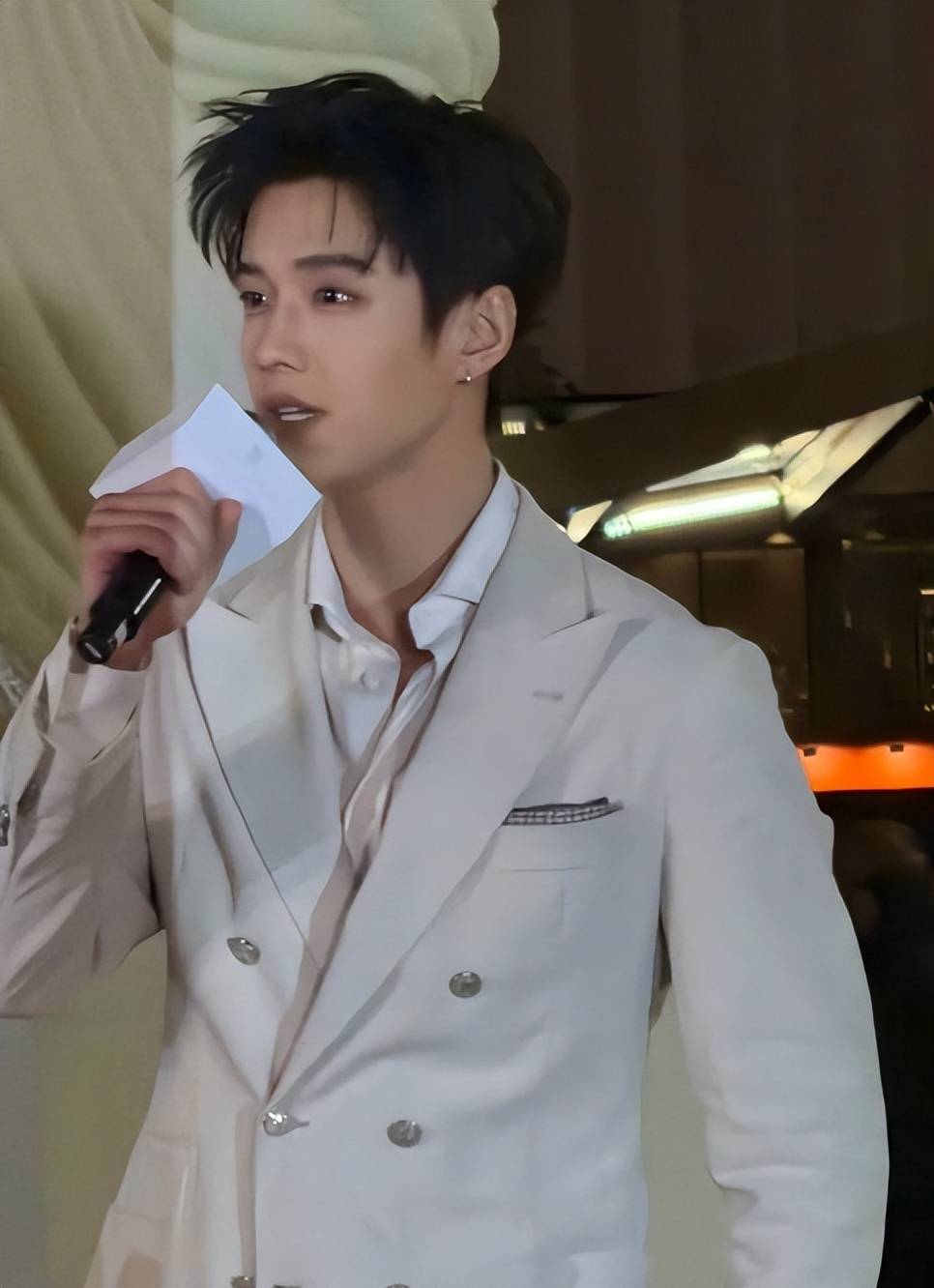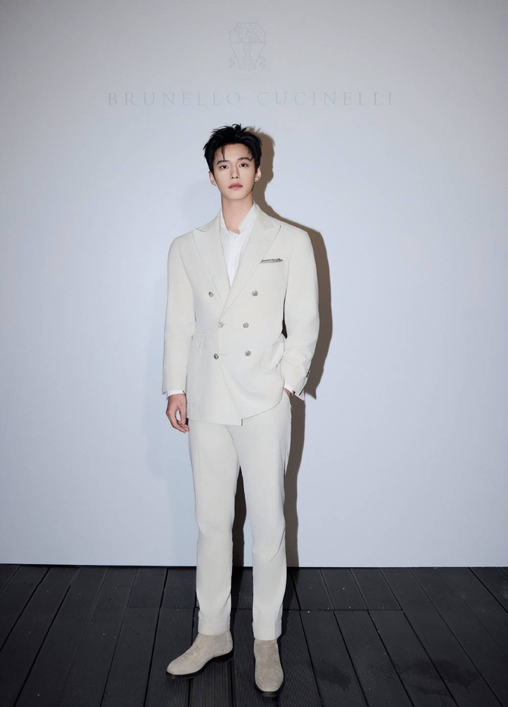 新生代演员何与的亮相令人耳目一新。米白西装衬托出书卷气息,清爽短发凸显立体五官。青春是最好的妆容,即便特写镜头下肌肤仍无懈可击。清晰的颌线融合英气与俊秀,优越的骨相条件预示着他将拥有持久的荧幕生命力。若能在演技上持续精进,未来可期。