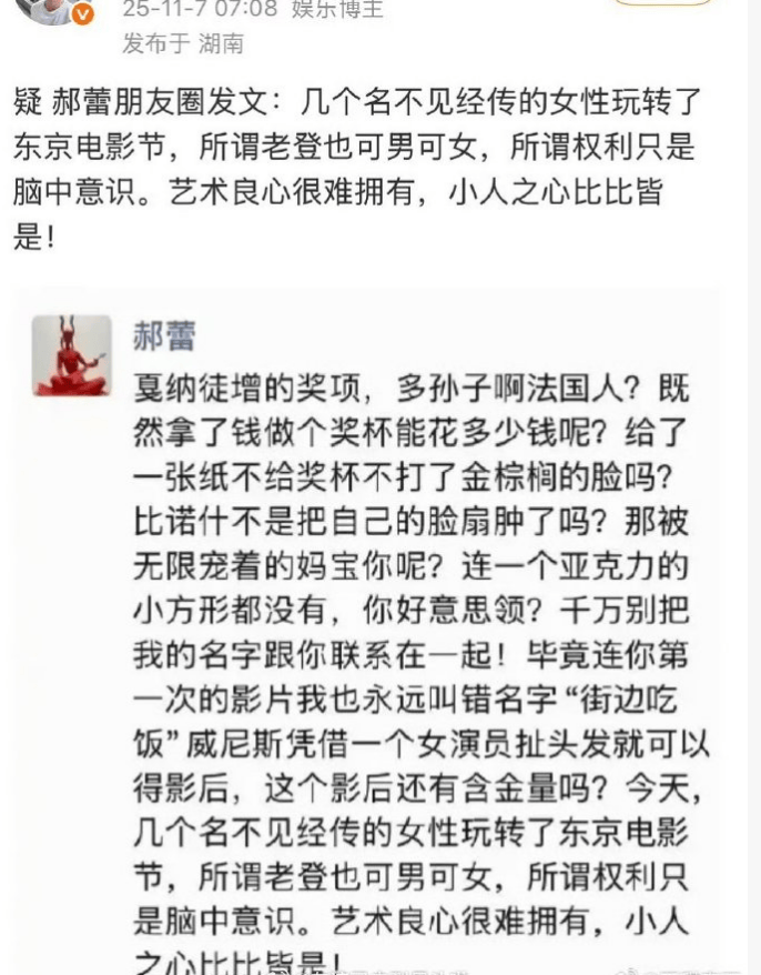2025年11月7日,辛芷蕾主演电影《日掛中天》上映当天,网传郝蕾朋友圈发文质疑国际电影节奖项公平性。