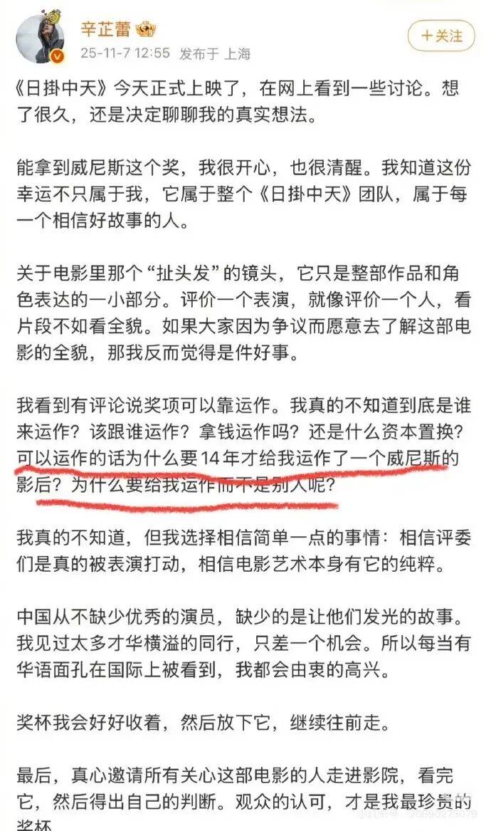 辛芷蕾同日发长文回应,强调"扯头发仅角色表达一小部分",呼吁观众关注表演全貌,并以六连问驳斥"运作论":"若可运作,为何14年才获首奖?为何选我?"获央视电影频道转发支持。