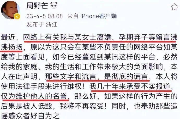 周野芒在声明中强调“未对不起任何人”,称隐忍30年是为保护他人名誉,直至2023年谣言蔓延至腾讯等大平台才启动法律程序。他律师透露诉讼仅针对网络侵权用户,未将奚美娟列为被告,旨在“避免扩大矛盾”。