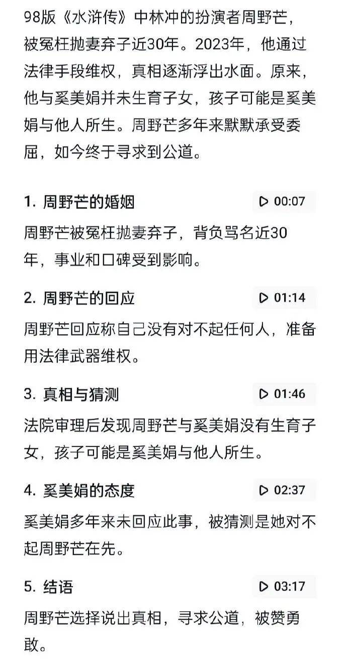 有爆料者揭发,奚美娟长期以“被抛弃的单亲妈妈”形象获得公众同情,凭借“德艺双馨”标签担任中国文联副主席(副部级)、金鸡奖评委会主任等职务,而周野芒因骂名事业受阻,《水浒传》林冲一角后,他资源锐减。