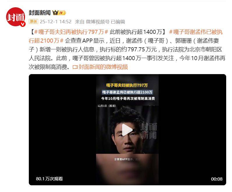 昔日家喻户晓的“小兵张嘎”,如今成了法院执行名单上的常客。据12月1日报道,近日,演员谢孟伟与其妻郭珊珊新增一则被执行人信息,执行标的797万元,再次将这位童星出身的艺人推上风口浪尖。这已是他们今年内多次上榜,累计未履行金额已超过2200万元。