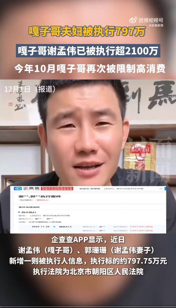 据公开信息显示,此次执行由北京市朝阳区人民法院实施,执行标的为797.75万元。而这仅仅是冰山一角。此前,谢孟伟已因多起纠纷被多次列为被执行人,执行总金额超过1400万元,并在今年10月被下达了限制消费令。如今新旧债务叠加,其名下累计被执行总额已飙升至2202.75万元,涉及民间借贷、合同纠纷等多种类型,财务状况可谓一地鸡毛。
