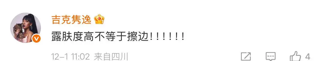歌手吉克隽逸近日因穿搭风格引发关注,部分网友质疑其 “穿搭布料少算擦边”,对此她在社交平台评论区作出回应:“露肤度高不等于擦边”。