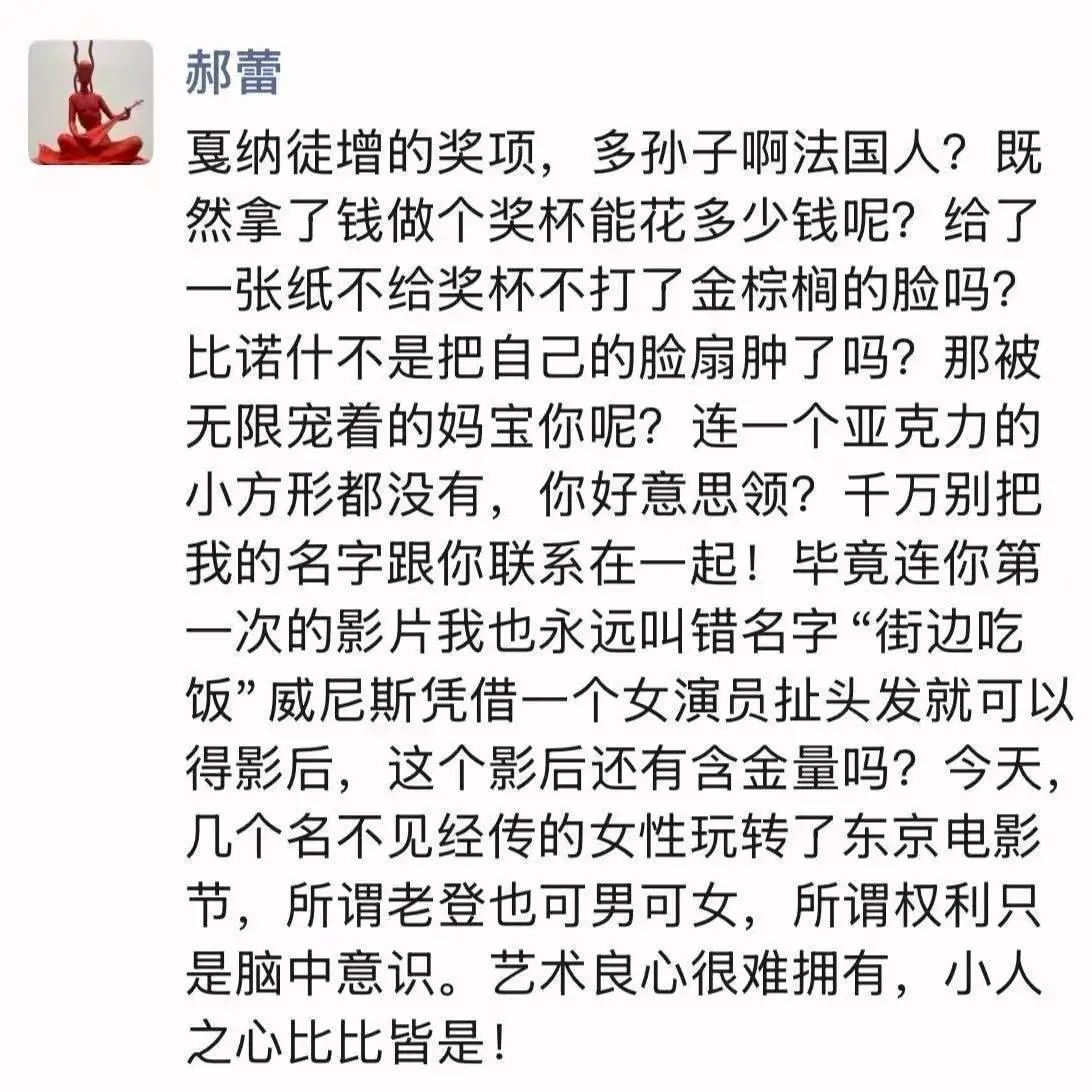 郝蕾12月1日在活动现场公开回应,强调朋友圈内容被误读为针对辛芷蕾是 “巨大乌龙”,事发当日已与辛芷蕾私下沟通,澄清质疑对象并非她。此前,郝蕾在朋友圈发文质疑电影节相关内容一事引发热议。