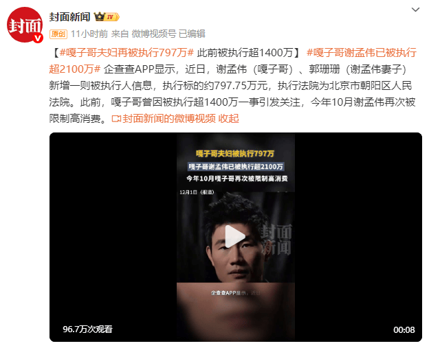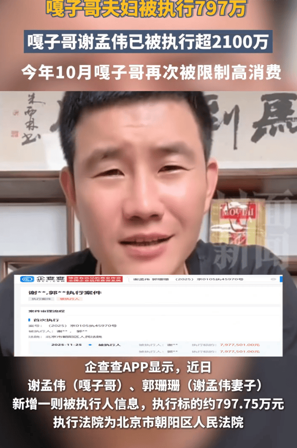 (来源:封面新闻)企查查APP显示,近日,谢孟伟(嘎子哥)、郭珊珊(谢孟伟妻子)新增一则被执行人信息,执行标的约797.75万元,执行法院为北京市朝阳区人民法院。此前,嘎子哥曾因被执行超1400万