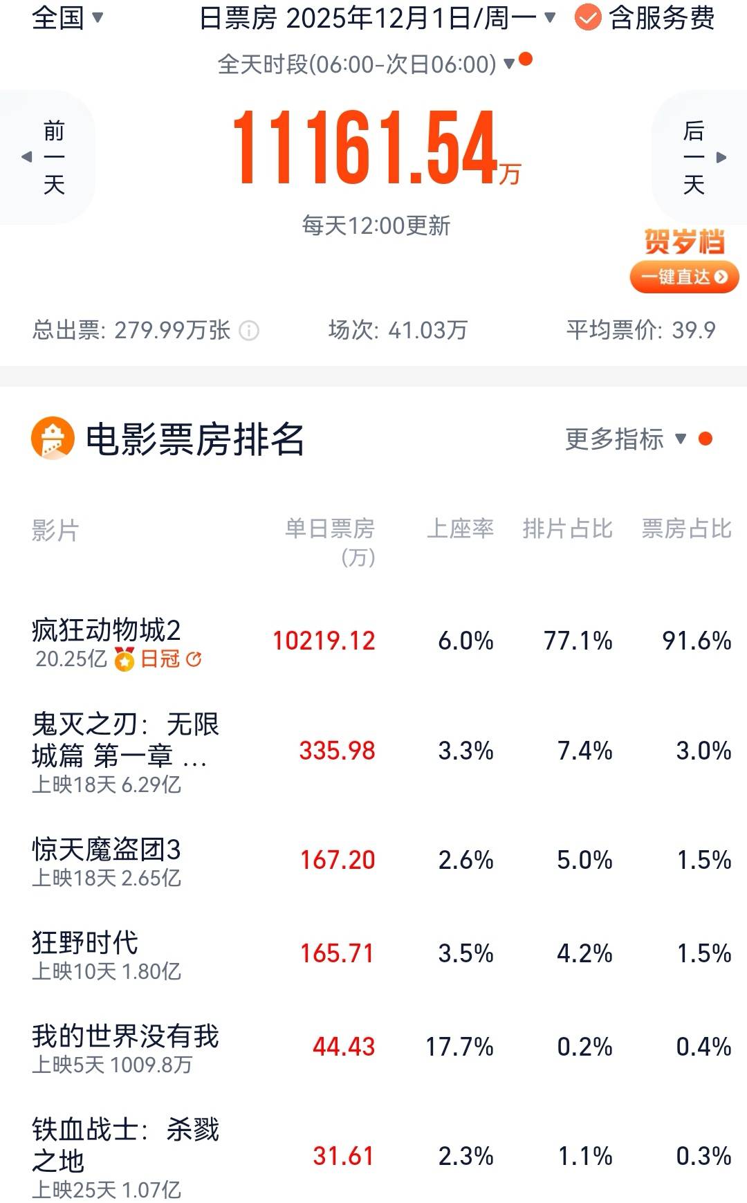 在中国市场上映第六天,迪士尼动画续作《疯狂动物城2》累计票房突破了20亿元,超过《熊出没·逆转时空》,成为内地影史动画票房前三名,仅次于两部《哪吒》。
