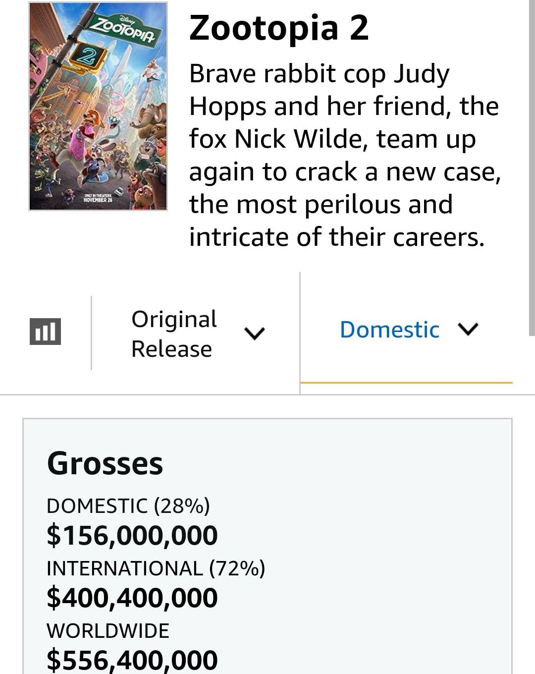 北美市场,《疯狂动物城2》上映5天票房1.56亿美元,加上4亿美元的海外市场票房,全球首周票房已达5.56亿美元,破动画电影全球开画票房纪录,开画成绩在影史仅次于《复仇者联盟4》、《复仇者联盟3》《蜘蛛侠:英雄无归》。