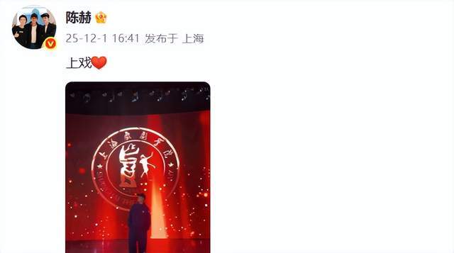 王冠在上海戏剧学院建校80周年高质量发展大会上进行诗朗诵!2025年12月1号下午16:41.著名男演员陈赫在其个人社交平台发文称:上戏[心]与此同时,陈赫还发布了一张自己在母校上海