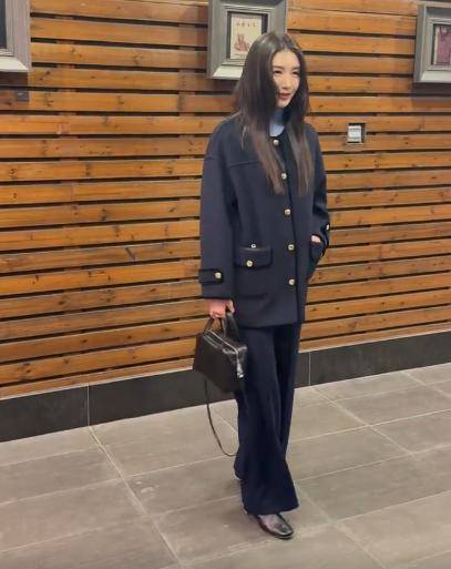 当天她穿着一身黑西装套装,内搭是很清爽的蓝色,裤子笔直踩双黑高跟,气场稳稳的。