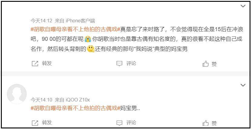 果不其然,胡歌和他妈妈都被吐槽了,有网友觉得胡歌43岁了还把妈妈挂嘴边,好一个妈宝男;有网友觉得胡歌就是靠古偶火的,却因为妈妈的话否定来时路,不愧是妈宝男。