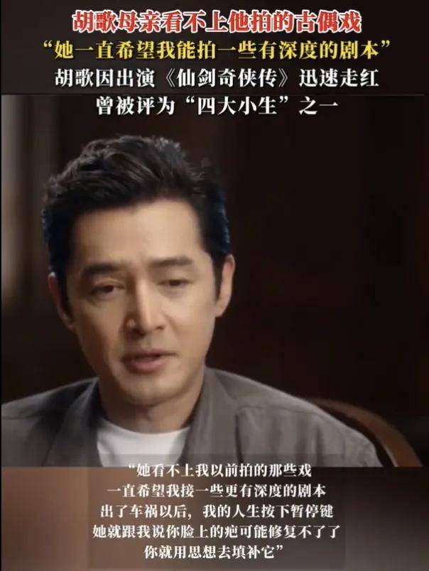 2006年,24岁的胡歌遭遇车祸,脸部受伤严重,一度认为无法再做演员,复出之后处于事业迷茫期,就像明星一到三四十岁就有人催他们转型一样,胡歌妈妈并非看不上古偶戏,而是从儿子实际情况出发,知道胡歌不能一辈子靠脸吃饭,才会提醒他需要接更多有深度的戏。
