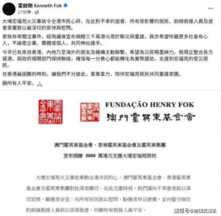 11月27日,霍启刚郭晶晶家族为香港大火,直接捐出3000万元!