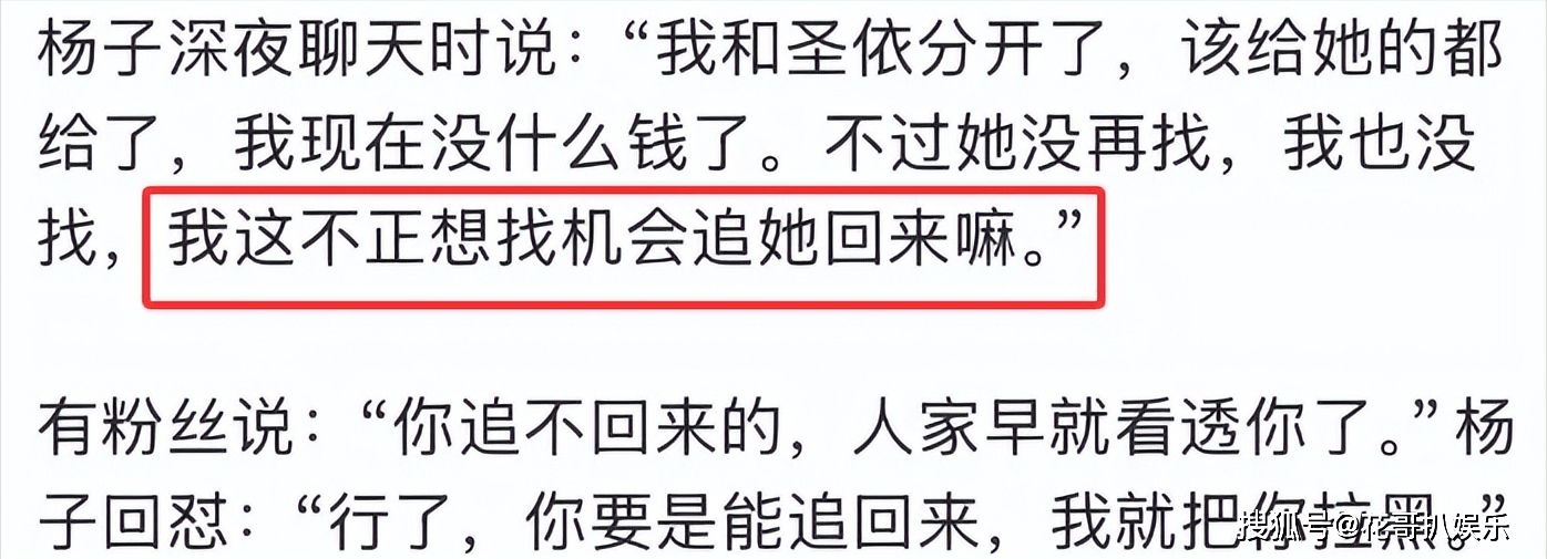 其实一开始杨子直播是为了带货的,但是可能他自己没什么热度,于是自导自演了一场追妻火葬场戏码。话里话外都在透露着他对失去黄圣依的追悔莫及,还想要把她追回来,那语气,委屈得像个被抛弃的小媳妇,不知道的还以为他是什么深情好男人呢。