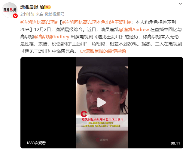 (来源:潇湘晨报)12月2日,潇湘晨报综合。近日,演员连凯在直播中回忆与高以翔出演电视剧《遇见王沥川》的经历,称高以翔本人无论是性格、表情、说话都和“王沥川”一角相
