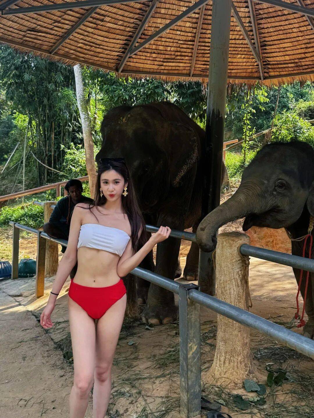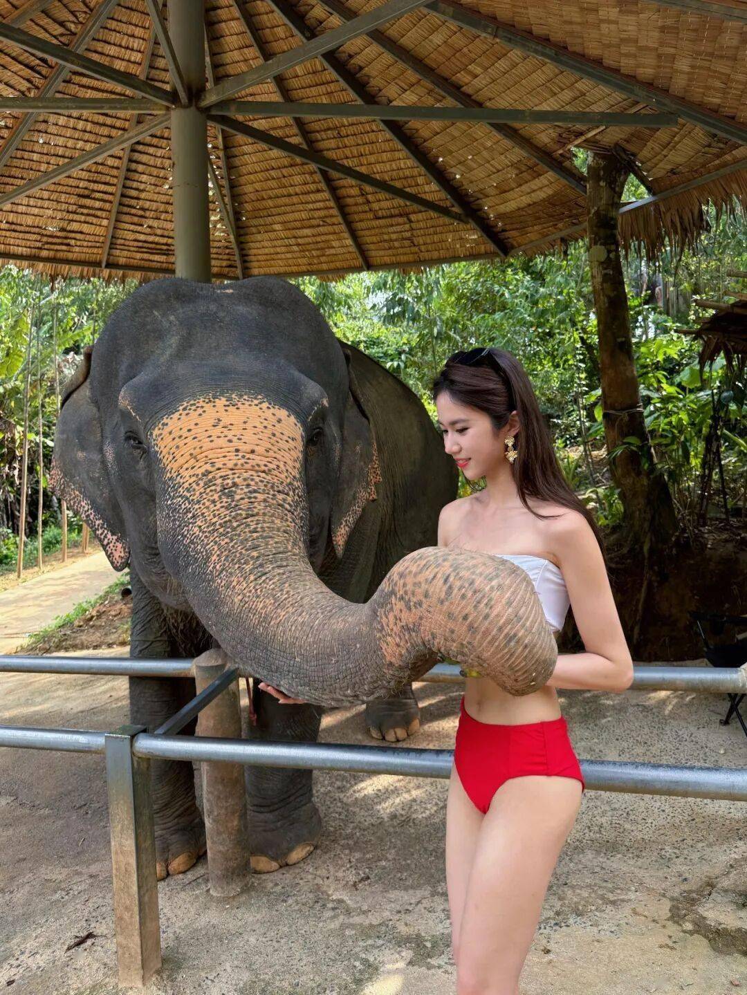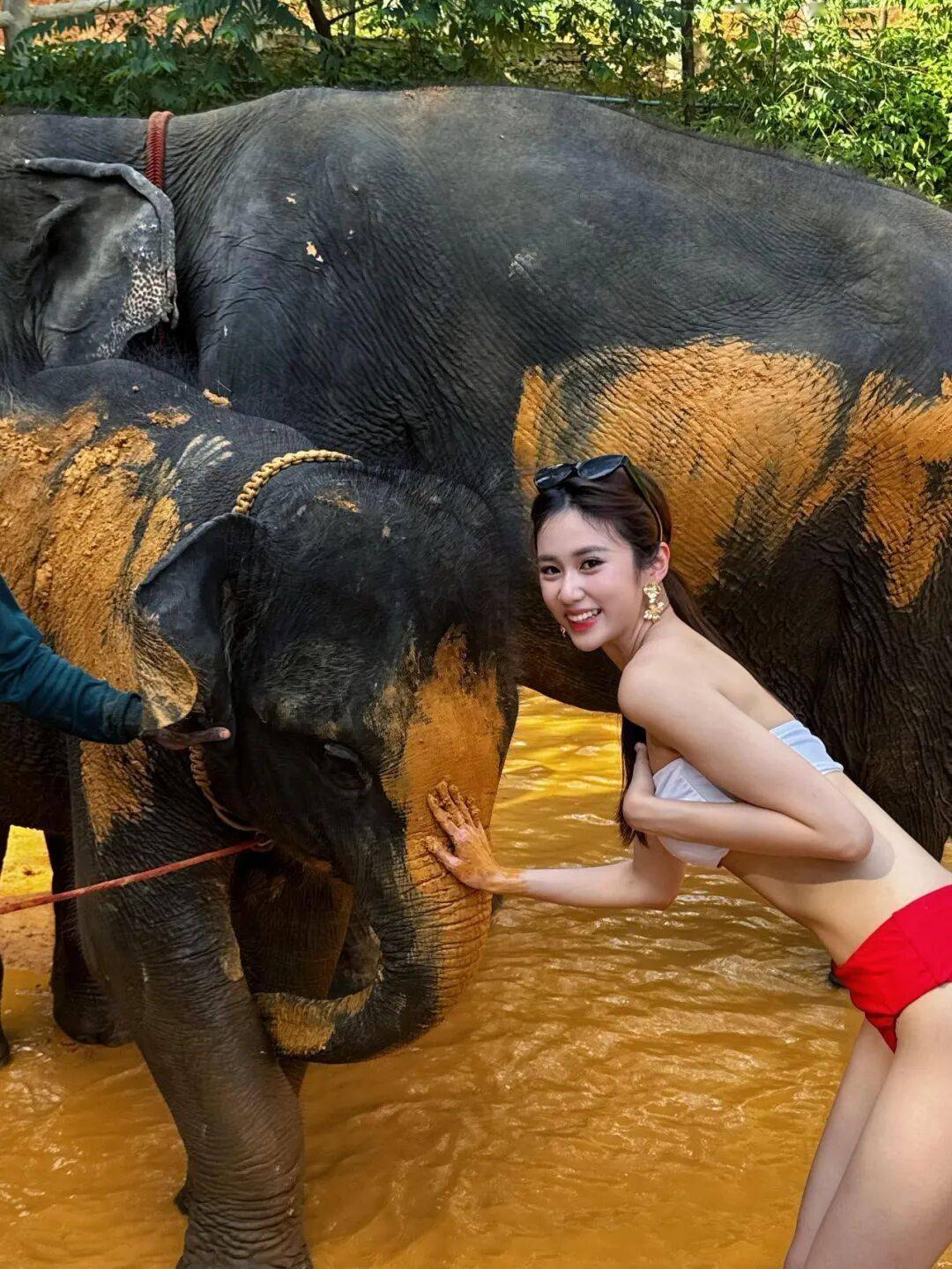 为体验活动,杨梓瑶换上一套白配红的性感抹胸式比基尼,她除了在泥浆浴中与大象互动,更贴近象鼻拍照留念,堪称美女与“野兽”!
