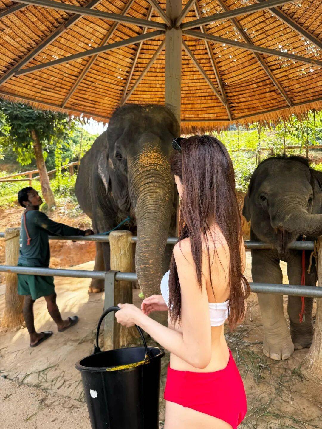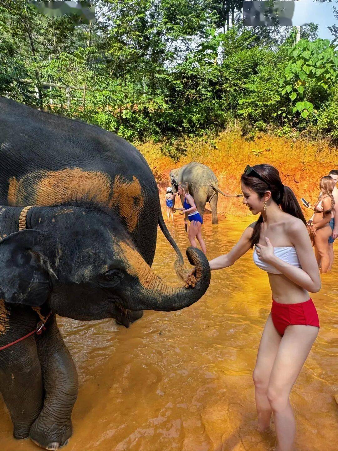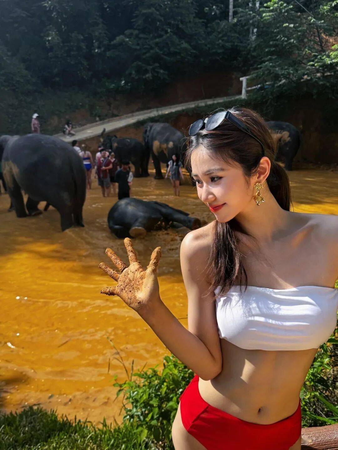 为体验活动,杨梓瑶换上一套白配红的性感抹胸式比基尼,她除了在泥浆浴中与大象互动,更贴近象鼻拍照留念,堪称美女与“野兽”!