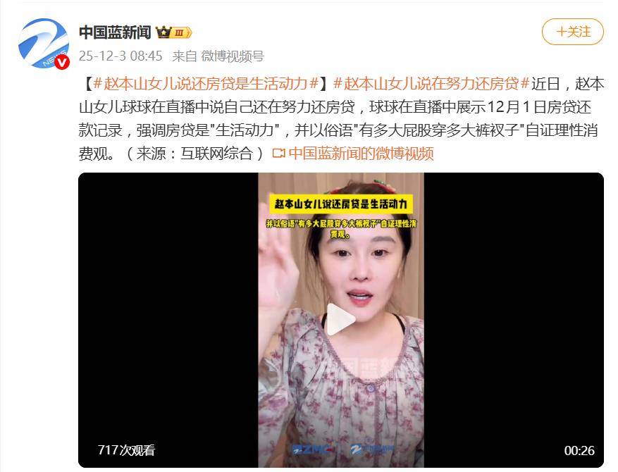 据12月3日报道,赵本山女儿球球(本名赵珈萱)在直播中晒出房贷还款记录,坦言自己仍在努力还贷,并将房贷称为“生活动力”。一句接地气的“有多大屁股穿多大裤衩子”,更是搬出父亲赵本山的俗语来佐证自己的理性消费观。然而,这番“经济独立”的宣言非但没赢得满堂彩,反而在网络上演了一出“理解分歧”大戏。