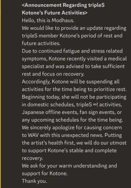 近日,新生代女团TripleS成员Kotone的遭遇在K-pop粉丝圈掀起波澜。一段她本人对紧凑行程的公开抱怨言犹在耳,所属公司MODHAUS便在数日后宣布她将“暂停所有活动”。