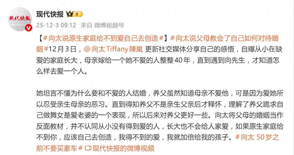 一句“原生家庭给不到你,应该自己去创造”,让向太陈岚的童年伤疤,成了全网热议的“疗愈课”。12月3日,这位向来以强势、风光形象示人的豪门女强人,在社交媒