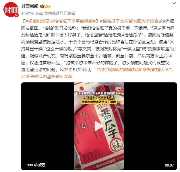 据网友截图,“洽洽”品牌官方账号发帖称:“我们洽洽瓜子真的很干燥,不潮湿。”评论区有网友称洽洽瓜“紫”那个梗太好笑了,洽洽回复“洽洽瓜紫≠洽洽瓜子”,遭网友质疑内涵杨紫剧集数据注水。十余家曾和杨紫有过合作的品牌官方账号,在评论区集体互动,还用上了 “保持嘴巴干燥”“这么干燥的瓜子” 这类文案,被网友调侃是 “干燥联盟” 或 “受潮者联盟” 在线团建,疑似在联合玩梗,而杨紫粉丝则要求这些品牌进行全平台道歉。截至目前,洽洽官方未正式回应,仅通过客服回应,“抱歉给您带来不好的体验了,您反馈的问题我们很重视,这边登记您的问题,反馈给相关部门。”