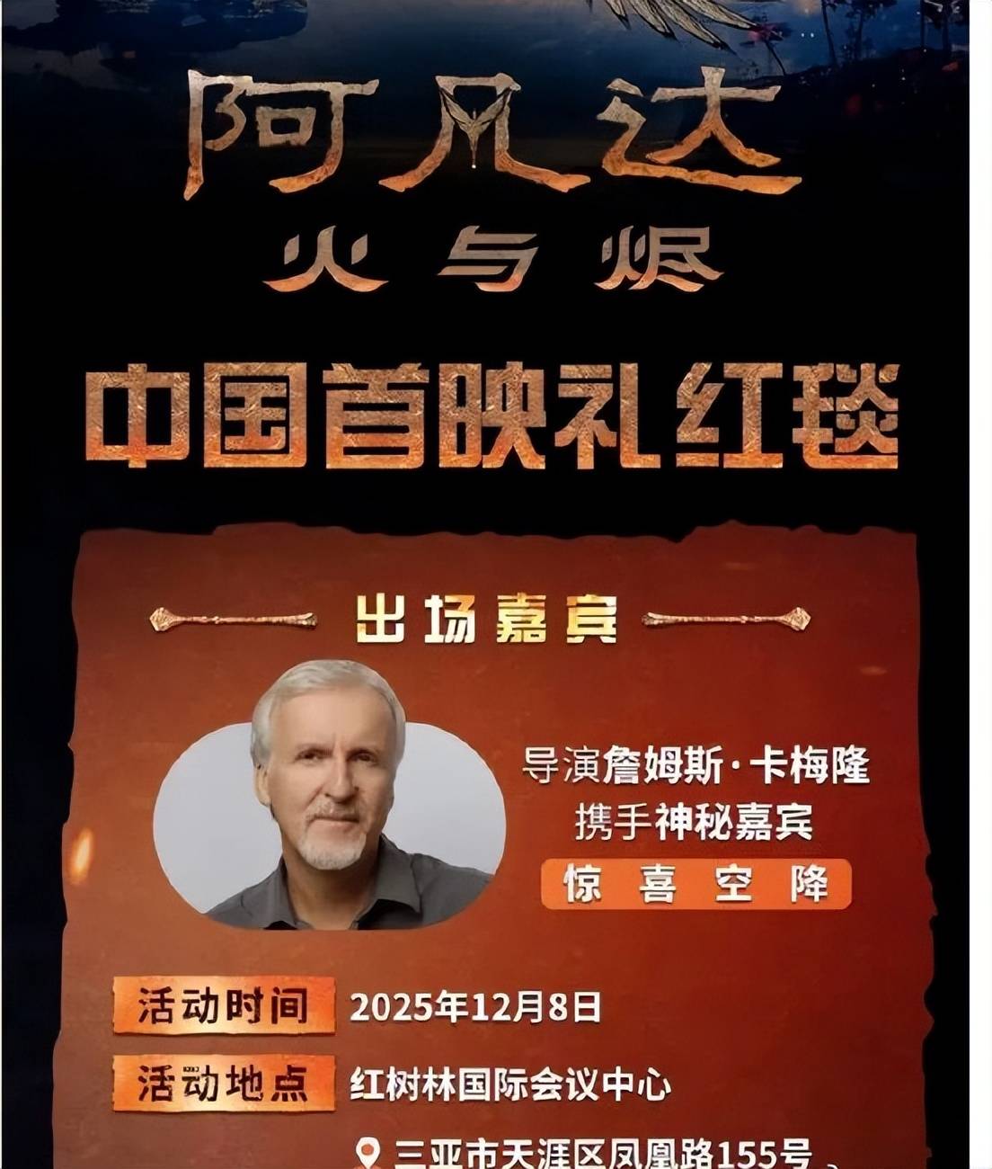 原定12月8日海南三亚首映礼红毯环节因"不可抗力因素"紧急取消,导演卡梅隆及主创团队无法到场。已购票观众将获14日内全额退款及《阿凡达3》电影兑换券补偿。