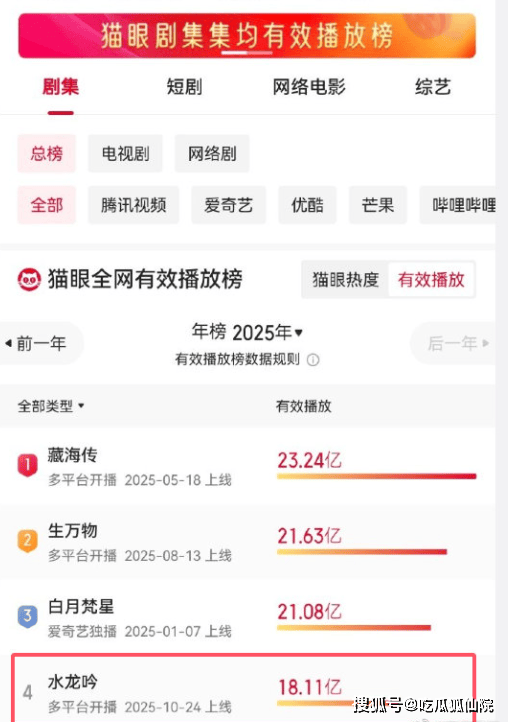 2025年猫眼全网有效播放年榜火热出炉,一部《水龙吟》如同一颗耀眼的流星,以18.11亿的有效播放量强势跻身TOP4,瞬间成为大众热议的焦点。这部剧能取得如此佳绩,罗云熙的精彩演绎