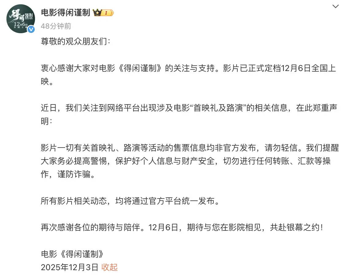 3日,电影得闲谨制发布声明:近日,我们关注到网络平台出现涉及电影“首映礼及路演”的相关信息,在此郑重声明。影片一切有关首映礼、路演等活动的售票信息均非官方发布,请勿轻信。我们提醒大家务必提高警惕,保护好个人信息与财产安全,切勿进行任何转账、汇款等操作,谨防诈骗。所有影片相关动态,均将通过官方平台统一发布。